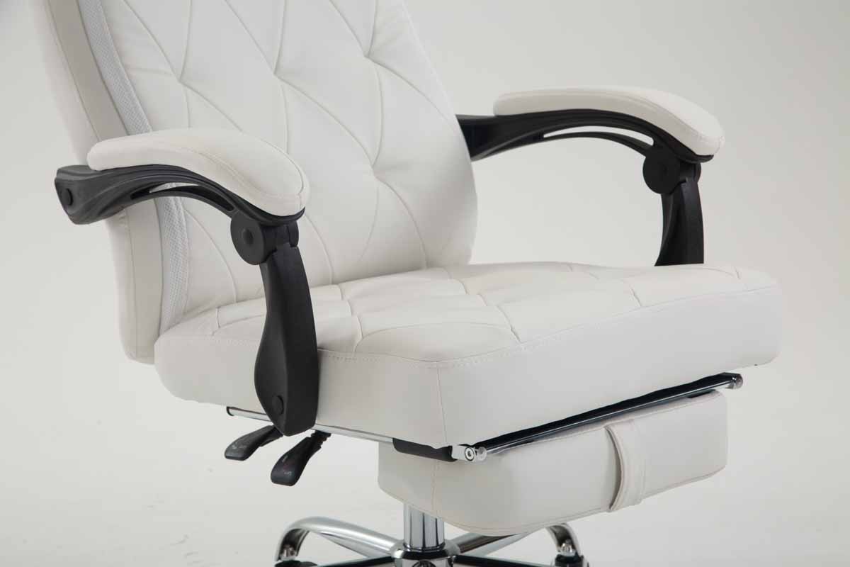 Dieser Chefsessel beeindruckt nicht nur mit seinem klassischen Look und seinen Ziernähten, sondern auch mit seiner integrierten Fußablage. Ein gelungenes Zusammenspiel zwischen Design und Gemütlichkeit. Die hochwertige Polsterung mit Kunstleder- oder strapazierfähigem Stoffbezug ist nicht nur besonders pflegeleicht, sie gewährleistet auch bei längerer Verweildauer ein angenehmes Sitzgefühl. Zudem wird ergonomisches Sitzen durch die stufenlos verstellbare Sitzhöhe unterstützt. Es wird eine Pause benötigt – mit diesem Stuhl ist das kein Problem! Die leicht verstellbare Fußstütze und Rückenlehne laden zum Verweilen ein, bei der entspannt werden darf und die Beine hochgelegt werden können. Dabei steht er standsicher auf fünf Leichtlaufrollen und einem Gestell aus Metall in Chromoptik. Egal ob Hart- oder Teppichböden, man kann immer leicht und locker über den Boden rollen. Materialzusammensetzung Sitzbezug: Kunstleder (100% Polyurethan) oder Stoff (100% Polyester)