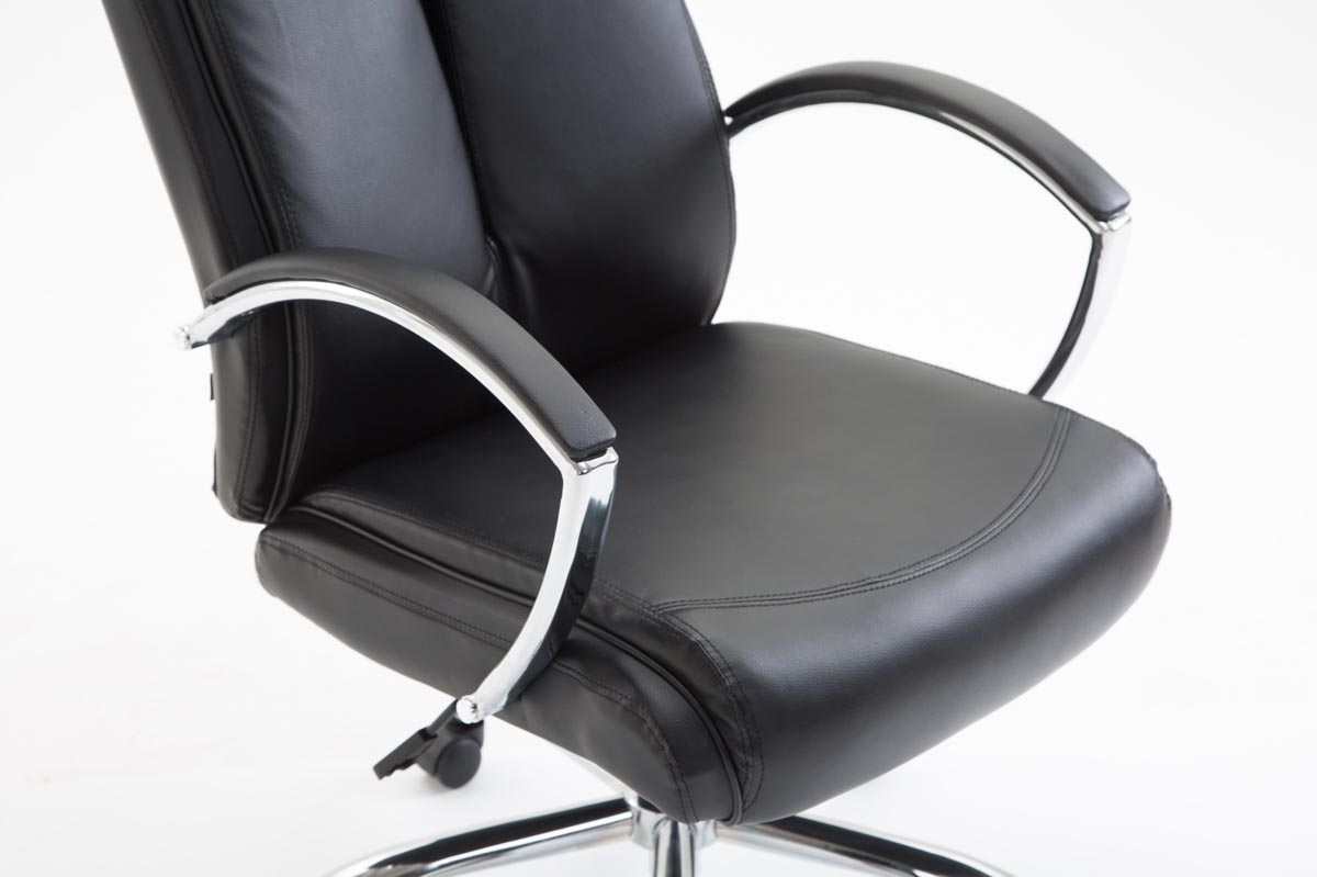 Der XL Bürostuhl Vaud ist ideal für große und schwere Personen geeignet, da die Gasdruckfeder auf einen dauerhaften Gebrauch bis zu 140 kg ausgerichtet ist. Es handelt es sich um einen Bürostuhl mit hochwertiger Polsterung und Kunstlederbezug. Kunstlederbezüge haben den Vorteil, dass sie elastisch sind und sich bei Entlastung wieder glatt ziehen. Dies sieht nicht nur schöner aus, sondern erhöht zusätzlich die Lebensdauer des Sitzbezuges. Die Sitzhöhe ist mit dem Hebel unter dem Sitz stufenlos verstellbar, dadurch ist ergonomisches Sitzen garantiert. Der eingebaute Wippmechanismus sorgt zudem für mehr Bewegungsfreiheit. Das Gestell des Bürostuhls besteht aus Metall in Chromoptik. Standsicher steht er auf fünf robusten Kunststofflaufrollen. Egal ob Hart- oder Teppichböden - Sie werden immer leicht und locker über den Boden rollen können.